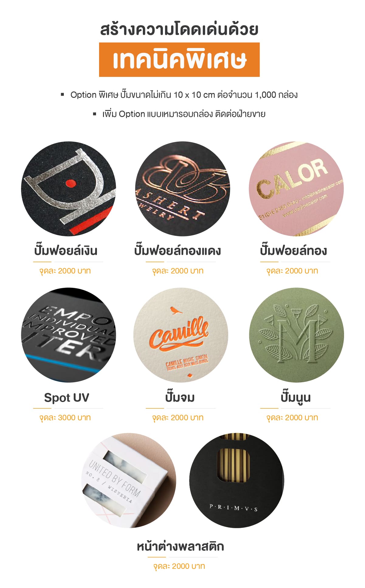 กล่องราคาโปรโมชั่นพิเศษ ราคานี้ไม่รวมเทคนิคเพิ่มเติม เช่น ปั๊มทอง ปั๊มนูน หรือ Spot UV